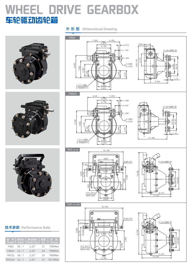 The TNT-2U gearbox features a 50:1 gear ratio, a 2.25″ diameter output shaftand a disengage-able worm gear for towing.